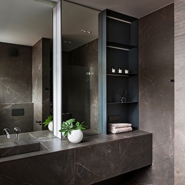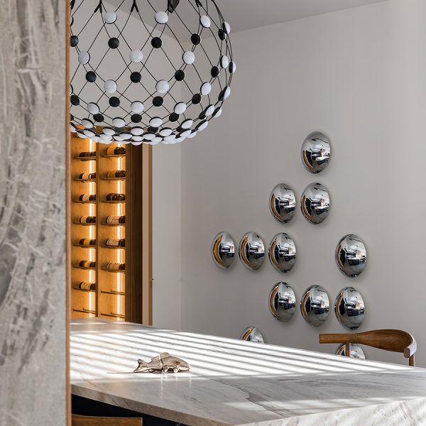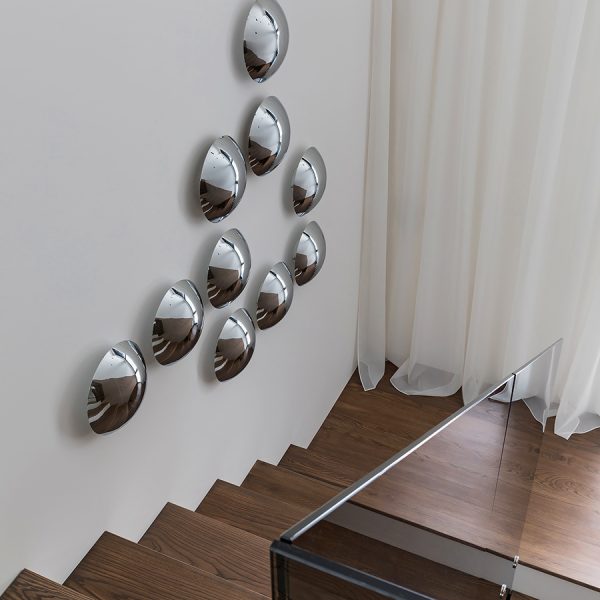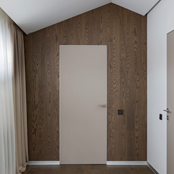 Natural variation of warm and cold shades, the contrast of natural wood and stone textures, metal and glass statements helped to create a serene quiet island, where owners can relax. Coswick Ash hardwood on the floor and on the walls fill the space with sun warmth.