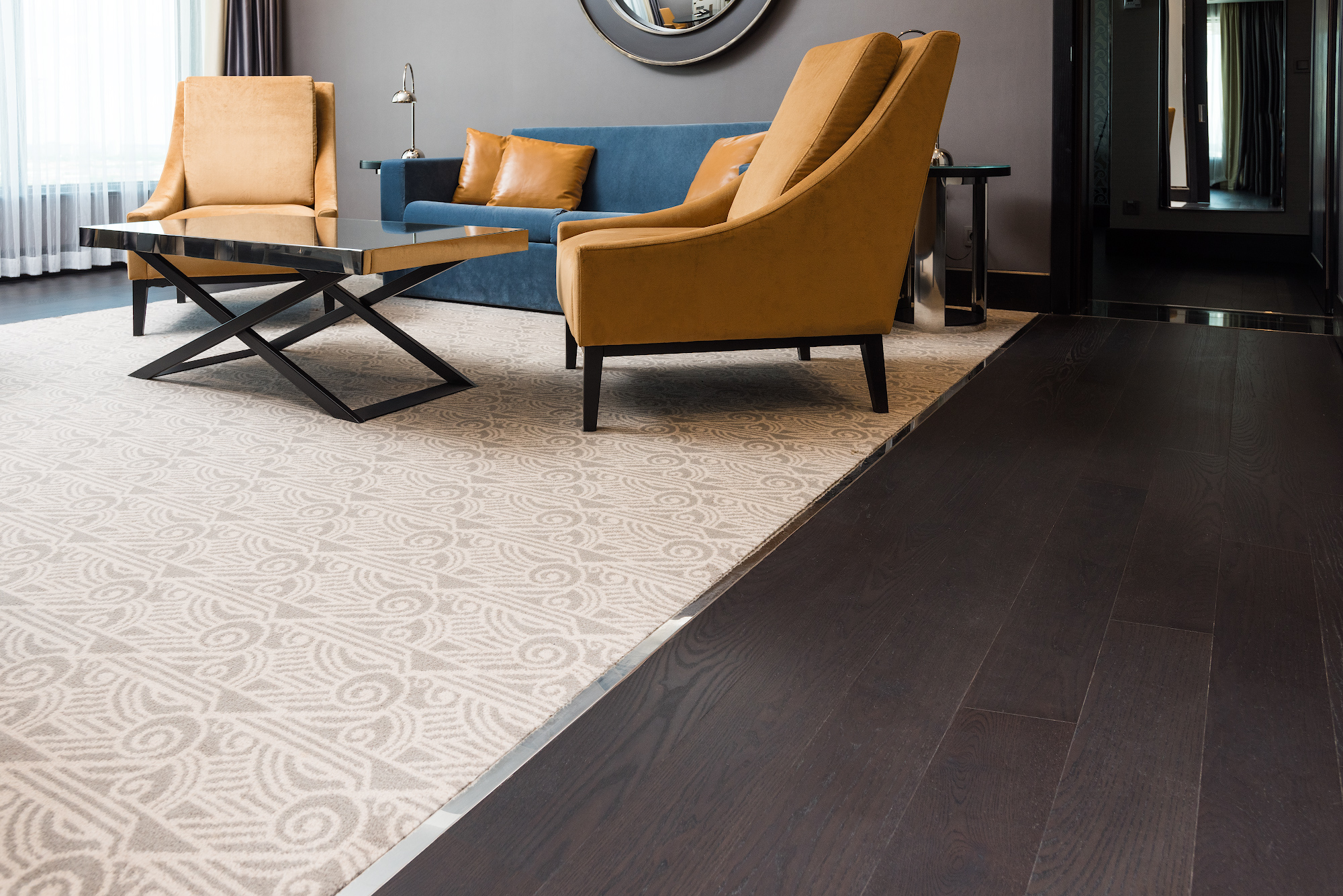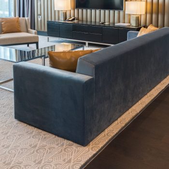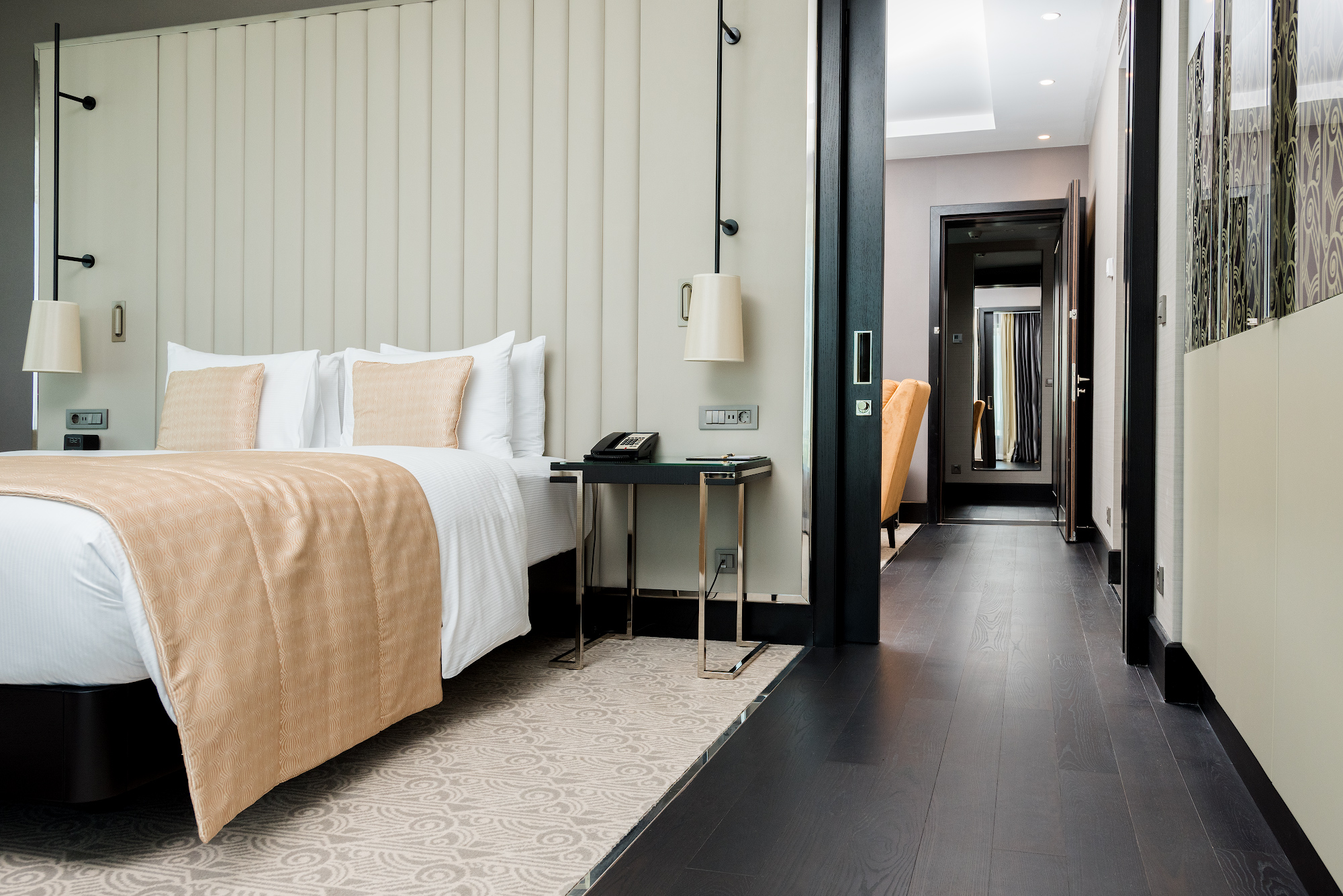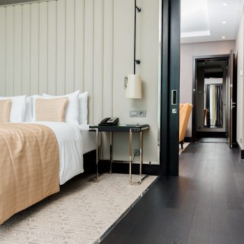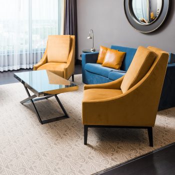 The interiors of specious rooms are based on a combination of warm shades and bright accents, clear geometric shapes and original decor elements in the art Deco style. A homely atmosphere and a comfortable rest create the use of natural materials in the decoration and natural textiles.