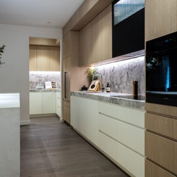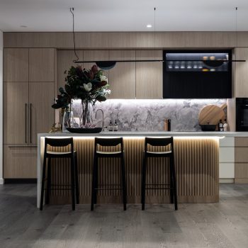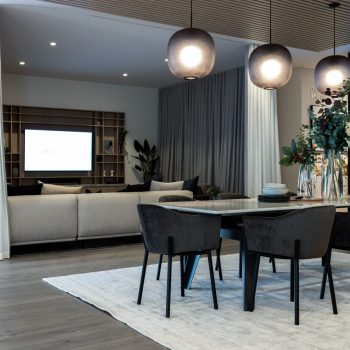 The same idea is traced in the interior design of apartments. A comfortable, functional layout is combined with a calm and natural palette and high-quality natural wood and stone finishes. The open space unites the living room, kitchen and dining room and easily zoned by a side curtain turning the living room into a cozy place where you can get privacy or, for example, spend an evening watching your favorite movie.