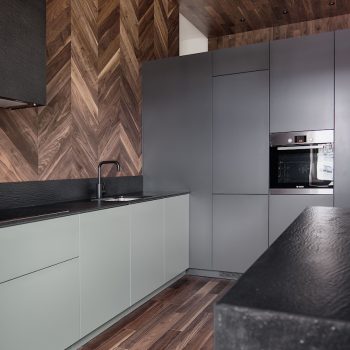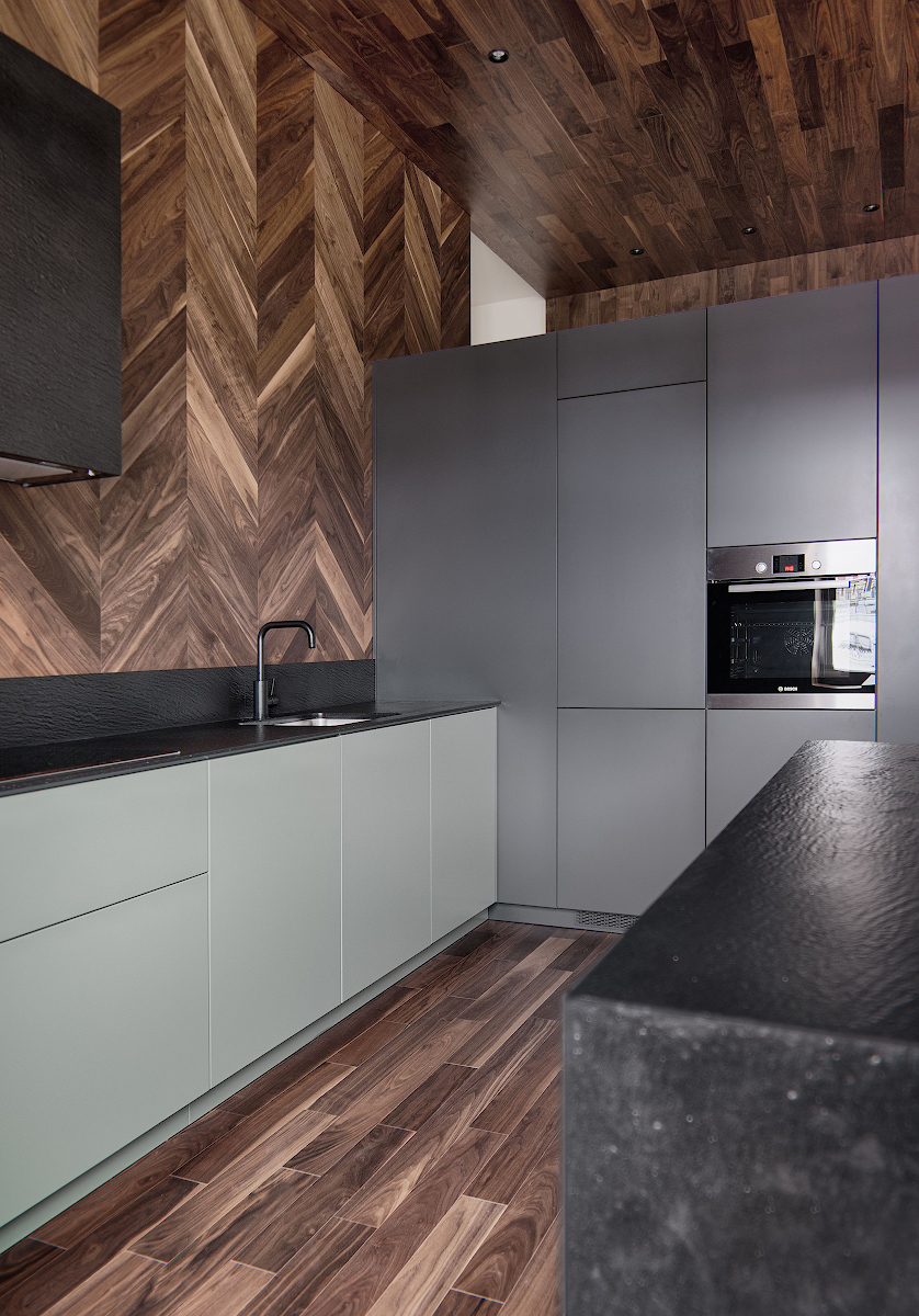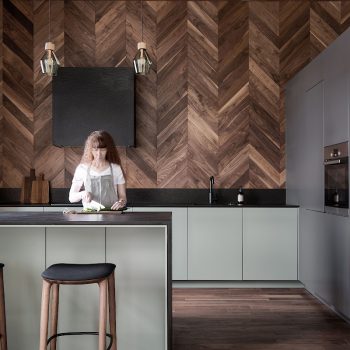 American Walnut chevron pattern on the wall in the walk-in kitchen, a hardwood corridor, which visually separates the kitchen and the vestibule, the concealed door covered in the same hardwood flooring highlights the minimalistic interior and supports the lightness and the airy feel of the overall design.