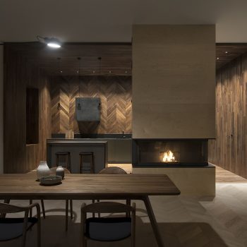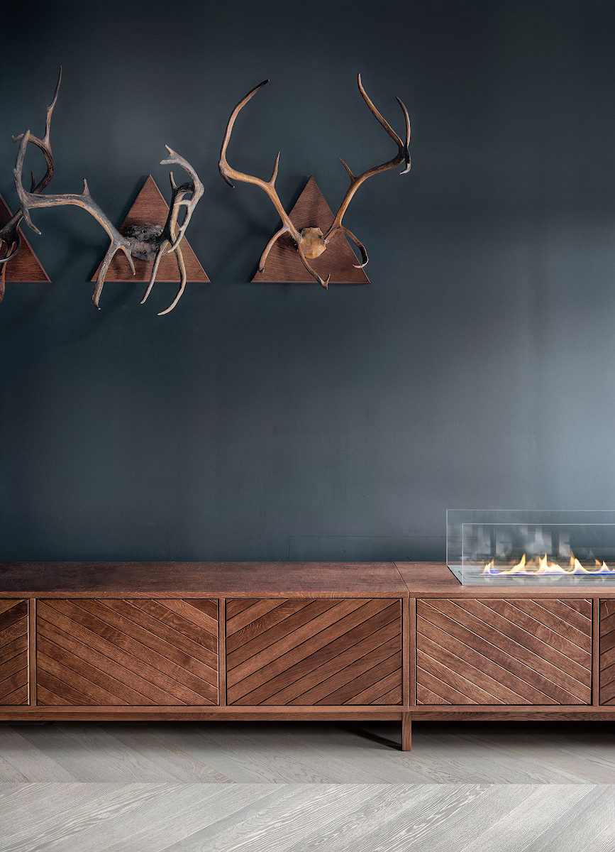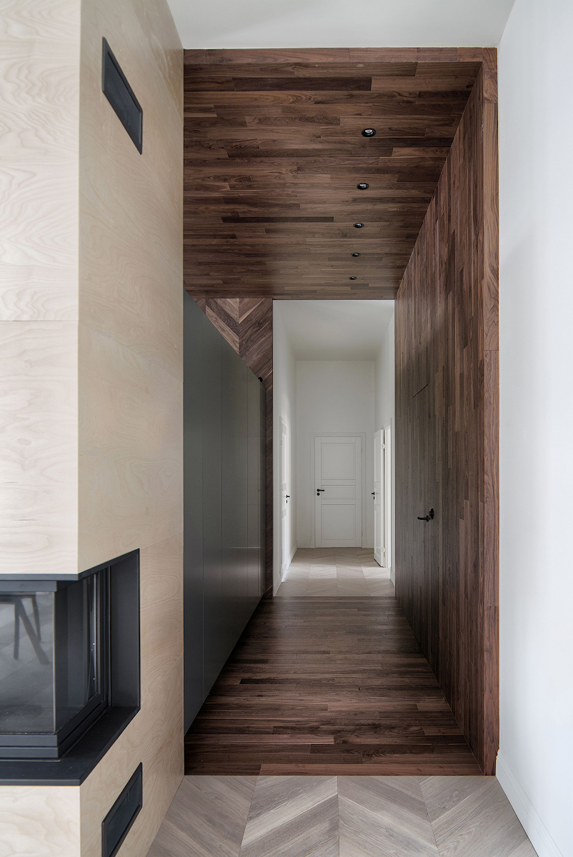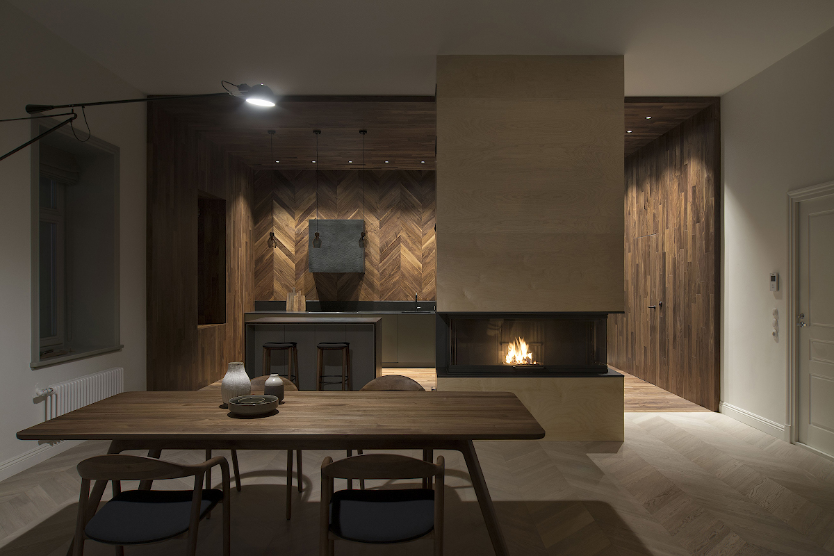 Wall panelling and a concealed door are created using chevron flooring. A prestigious ADD AWARD was presented for the project realized by a group of St-Petersburgh’s architects.
